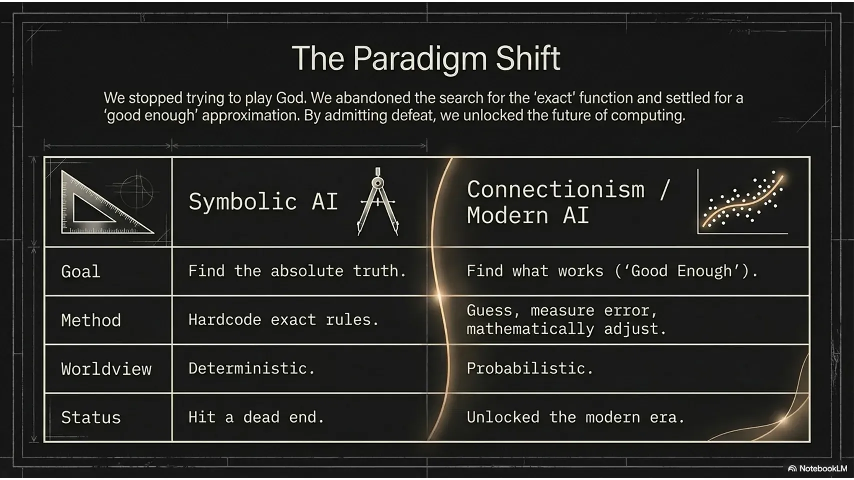 Home / Post Tech The Greate Compromise How surrendering certainty created modern AI, and what it reveals about probabilistic nature of the universe A Aaron JW April 13, 2026 Updated Apr 13, 2026 MathAIFunctionIntelligenceLogicRule